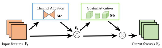 where represents the input feature map, represents the intermediate state, represents the channel attention module, represents the output feature map, represents the spatial attention module, and represents the element-wise multiplication.