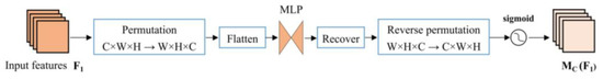 In the channel attention module, GAM uses a three-dimensional arrangement to preserve information across all three dimensions. Specifically, the input feature F1 is first reshaped from C × W × H to W × H × C. Then, a two-layer fully connected layer (MLP) is used to amplify the interdependencies between the spatial and channel dimensions. Finally, the three-dimensional arrangement is reshaped back into the original C × W × H form, as shown in Figure 2.