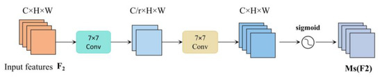 In the spatial attention module, GAM uses two convolutions to fuse spatial information in order to make the model focus on spatial information. At the same time, to avoid the loss of spatial information caused by pooling operations, pooling operations are not chosen, which further preserves the features, as shown in Figure 3.