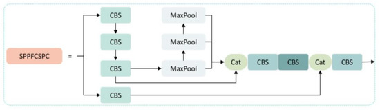 In previous convolutional neural networks (CNNs), a fixed size image needed to be inputted for networks with predetermined structures, resulting in cropping, scaling, and other operations being performed when detecting images of various sizes, which decreased the precision of the detection. To address this problem, many excellent spatial pyramid pooling methods have been proposed, such as SPP [31], SPPF, ASPP, and SPPCSPC, which allow the network to input images of any size without the need for cropping, scaling, and other operations. This effectively avoids problems, such as image distortion caused by cropping and scaling operations on the image area, solves the problem of convolutional neural networks extracting repetitive features related to images, and improves the precision and speed of generating candidate boxes. SPPFCSPC [32] is an optimization of SPPCSPC based on the idea of SPPF, aimed at accelerating training and inference, as shown in Figure 5. By linking three separate pooling operations, less computation is required on the output results of the pooling layer with a smaller pooling kernel. This approach produces pooling layer results equivalent to those obtained with a larger pooling kernel, achieving a speedup while maintaining a constant perceptual field. The calculation formula for the pooling part can be expressed as follows: