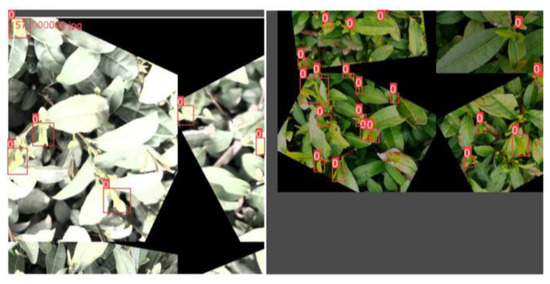 The effect of mosaic data augmentation. 0 and red boxes represent the category of tea buds.