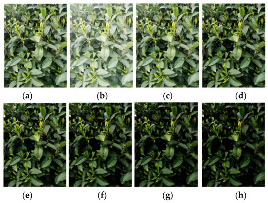 Results of the gamma transformation under different gamma values: (a) original image; (b) γ = 0.5; (c) γ = 1.0; (d) γ = 1.5; (e) γ = 2.0; (f) γ = 2.5; (g) γ = 3.0; and (h) γ = 3.5.