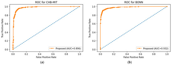 (a–c) ROC-AUC curve for the proposed epileptic seizure prediction on (a) the CHB-MIT dataset, (b) the Bonn dataset, and (c) the NSC dataset.