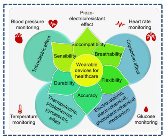 Necessary Elements for Wearable Healthcare Monitoring Devices: When creating a health-monitoring device, several variables must be considered. The necessity that the electrodes, sensor technology, and supportive substrate do not interact negatively with or harm organs and tissues is known as biocompatibility, and it is an important factor to consider when choosing materials. Second, comfort is always linked to breathing ability when ongoing health monitoring is involved. To release the perspiration produced by the human body and prevent irritation of the skin and tissues, health-monitoring gadgets with porous designs and hydrophilia are greatly wanted. Third, the degree of stretchability and flexibility decides whether the produced device may be included in wearable clothing or patches, etc. Therefore, flexible organic polymers with strong mechanical properties are appropriate options for substrate films. Fourth, the sensitivity and accuracy indicate the reaction time, detection threshold, and distinction between the responding signals and their actual physiological counterparts, all of which have a significant impact on the practical application in medicine. Fifth, the factors of stability and durability are crucial for industrialization and commercialization. Health-monitoring gadgets’ capacity for self-power and self-healing are also two essential elements for their actual use.
