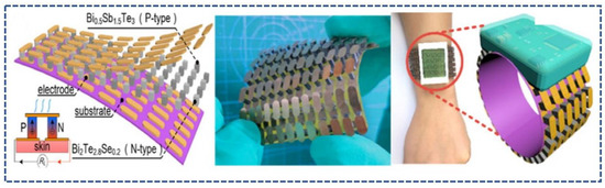 Flexible WTEGS: Considering the intricate and dynamic shaping of the human body, rigid wearable thermoelectric sensors are ruled out of use at some parts. For such situations, the concept and use of flexible TEGs as potential mediums/candidates for wearable smart healthcare sensors have been proposed [101]. This helps to cover the areas such as the arms and dynamic surface parts that are the joints. This has further branched into stretchable and non-stretchable devices based on their areas and modes of working [102].