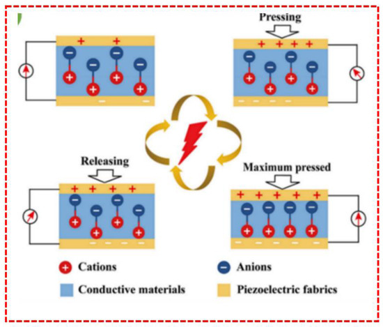 Piezoelectric Nanogenerators or PENGs are commonly made up of electrodes and piezoelectric materials [118]. The top and bottom sides of the piezoelectric materials that correspond to these surfaces experience an opposite-sign charge after polarization when PENGs are bent [119]. Figure 6 shows the basic structure of the piezoelectric principle; it is a diagrammatic representation of the procedure through which PENGs generate electricity when their buttons are pressed and subsequently released. The equivalent centers of charge for both cations and anions are still there, even when both types of ions are under stress. Both polarization and the generation of an electric current are nonexistent and do not happen [120]. The volume of the nanogenerator contracts when external pressures are applied, and it stretches oppositely [121]. This has the immediate effect of moving the cation and anion canters of charge, producing electric dipoles, developing a piezoelectric potential between the two electrodes, and creating a new balancing condition [122].