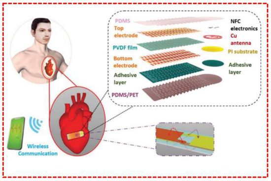 In Figure 8, Ferroelectric polymer transducers and organic diodes are shown for unnoticeable sensing and energy-harvesting devices [131]. They have a great flexibility since they are integrated on 1 m thick ultrathin surfaces [132]. Simulations have shown that the sensitivity of extremely flexible ferroelectric polymer transducers is considerably increased by using an ultrathin substrate, which permits mounting them on 3D-shaped objects and stacking them in many layers [133]. Due to their enhanced sensitivity to strain and pressure, rapid response, and outstanding mechanical stability, ultra-flexible ferroelectric polymer transducers form invisible wireless e-health patches for precise pulse and blood pressure monitoring [117,134].