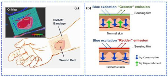 A new type of smart bandage that uses electrostatic sensors may make treating wounds simpler, more efficient, and less expensive. Despite traditional dressings, which are made of multiple layers of a sponge-like substance, smart bandages are made of a resilient and stretchable material with integrated circuitry and medicine. Electrostatic sensors keep an eye out for chemicals such lactate or uric acid, as well as pH or temperature changes in the wound that could indicate a bacterial infection or inflammation, which are shown in Figure 10a,b [199]. As shown in Figure 10b, a SMART bandage with an oxygen sensor is placed on healthy skin. Because of the high oxygen content in the tissue, the detecting phosphor’s red emission is quenched. The fluorescent reference dye causes the entire film to radiate a green color. Similarly, an oxygen-sensing SMART bandage is applied on ischemic skin at the bottom of the figure. Because there is less oxygen in the tissue, the bright red emissions of the detecting phosphor outperform the reference dye’s green fluorescence. The entire bandage is red in color.