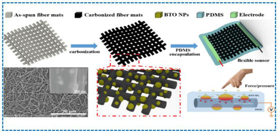 The two-principle mechanisms that enjoy an edge over single-principle sensors still fall short compared to three-principle mechanisms, because they are less flexible and their area of working is small compared to three-principle mechanisms, which can be generally understood because three-principle sensors use three sensor principles, which is more than two-principle mechanisms that use two principles. Three-principal mechanisms can be analyzed using the different studies performed to fabricate different sensors using three-principle mechanisms. In a study, it was reported that a carbonized electro spun polyacrylonitrile/barium titanate (PAN-C/BTO) nanofiber film sensor was fabricated using the piezoelectric, piezoresistive, and triboelectric principles; now, the importance of this sensor compared to a sensor that is fabricated using a two-principle mechanism is far more appealing, because this fabricated sensor can measure two parameters, namely pressure and curvature, and this can be performed independently or simultaneously, which is shown in Figure 12. Along with this, the use of titanate nanoparticles (BTO NPs) made its sensitivity very convincing, as it could perceive multiple human reactions such as gait, swallowing, and finger tapping [203].