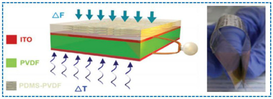 Thus, in another study, a hybrid sensor was created by combining the piezoelectric and resistive principles. The main focus was the proposition of smart skin comprising a PVDF and reduced graphene oxide(rGO) microtome structure; here, the nature of the materials used was majorly kept in view, so the piezoelectric and piezoresistive nature of the PVDF-rGO composites made the fabricated sensor perceive static and dynamic pressure along with temperature [201]. The study in the direction of a combination of piezoelectric and thermo-electric mechanisms was performed using organic piezoelectric poly (vinylidene fluoride) and thermos-electric polyaniline (PANI)-based composite films, for fabricating a flexible sensor that could perceive tactile stimuli and temperature without interference [202]. According to the above-mentioned studies, we come to understand that two-principle mechanisms are much more important and effective in the case of the fabrication of wearable smart health-monitoring commercial products, because it is has been proved to a great extent that, by using two single-principle based sensors, we can achieve multiple targets, such as power generation for making active sensors, as well as the detection of multiple physiological human interactions and signals.