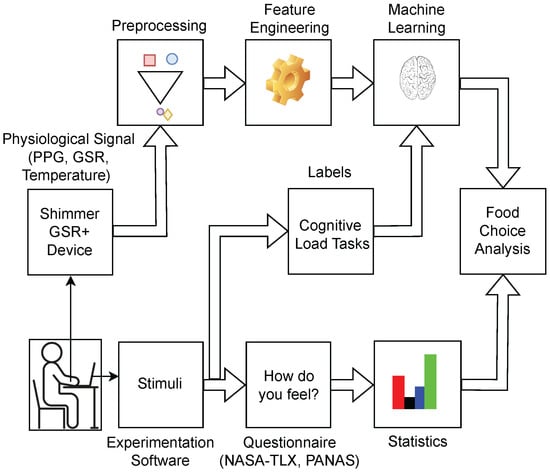 The experimental framework overview is presented in Figure 1, illustrating the data collection process involving physiological signals from Shimmer GSR+ device, questionnaires, and labels. The collected physiological signals undergo preprocessing, feature extraction, and classification using cognitive load task labels extracted from experimentation software. The questionnaires obtained from experimentation software are also subjected to statistical analysis. Subsequently, the classified cognitive load data, statistically analysed questionnaires, and food consumption records are integrated for food choice analysis. The study encompasses multiple stages, including data collection, preprocessing, feature extraction, classification, statistical analysis of questionnaires, and food choice analysis.