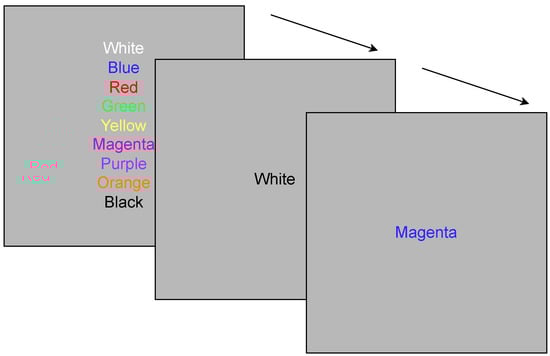 - Stroop, J.R. Studies of interference in serial verbal reactions. J. Exp. Psychol. 1935, 18, 643. [Google Scholar] [CrossRef]