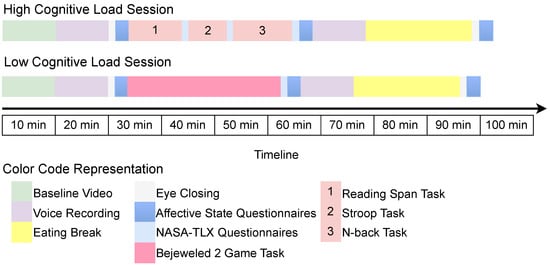 To conduct the experimental sessions, we developed experimentation software using PsychoPy version 2021.1.4, a cross-platform Python package [26]. We used the experimentation software to develop the sequences of cognitive tasks, stimuli, questionnaires, and instructions for the study and present them to subjects without interruption from the experimenter. We scheduled two data collection experimental sessions in a laboratory setting on two consecutive days to induce HL and LL tasks. In the first experimental session, subjects were randomly assigned to HL or LL sessions to avoid eating bias. The two experimental sessions included baseline video, voice recordings, cognitive load tasks, and questionnaires implemented in the software version 1.1.0. The sequence of tasks to be performed by the subject was displayed by the software, and the sequence is shown in Figure 3.