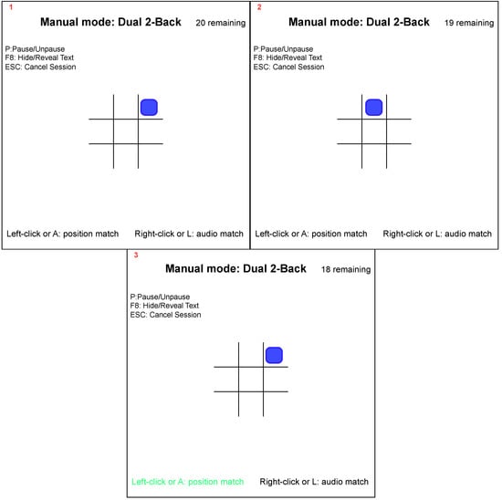 The final task, with a HL, was the dual-N-back task. Here, subjects had to simultaneously recall a sequence of spoken letters and positions of a square and recognise whether the letter or position of the square matched the one that had previously appeared [40]. If the subject’s performance in the first level of 1-back task (in which the subject had to recall only the square and letter displayed or announced before the current square or letter) was more than 80% correct, the identification length difficulty level was increased to 2-back, 3-back, and the like. Figure 4 demonstrates the 2-back task. The numbers written in red on the top left in the Figure 4 represent the flow of explanation of the block. In the first block, we have the blue square in the third position, first row. The blue square is present in the last row in the second block. In the third block, that is, after 2-back, the square position repeats its position. Since this position matches the square’s position in the first block, the subject would be required to press the left mouse button during the third block to indicate the correct occurrence of 2-back. The N-back task was played for only about 10 min. The N-back task was implemented by opening the Brain Workshop software version 4.8.4 [41].