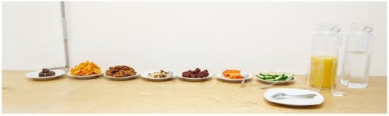 During the study, subjects were given a 20 min break and were offered following snacks: 3 chocolate bars without wrappers (3 × 18 g), potato chips (50–60 g), pretzels (70–80 g), nuts (50–60 g), grapes (70–85 g), carrot slices (70–85 g), cucumber slices (70–85 g), water (500 mL), and orange juice (500 mL). The foods were arranged as shown in Figure 5. We measured the weight of the snacks before and after consumption to calculate the calories consumed based on the calorie information on the food packaging. For the products for which calorie information was not available, we used the nutritionix website [47].