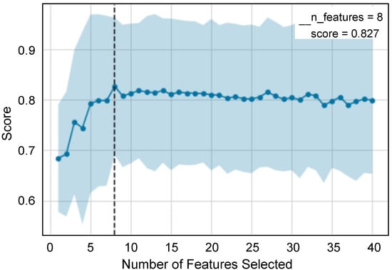 From the artefact-free windows, we extracted 125 features in the time and frequency domains from the GSR, PPG, and the temperature sensor signals. To solve the overfitting problem, we reduced the features. Two types of feature selection methods were used to reduce the features. First, the SelectKBest method was used, in which the features were reduced to the 40 most important ones. Then, the RFECV method with a RF classifier was used. Figure 6 shows the result of the RFECV method, where the x-axis represents the number of features and the y-axis represents the F1-score obtained for these features for the RF model. From Figure 6, it can be seen that the RF model with eight features obtained the best F1-score of 0.827. Table 6 shows the eight features, five of which are from GSR.