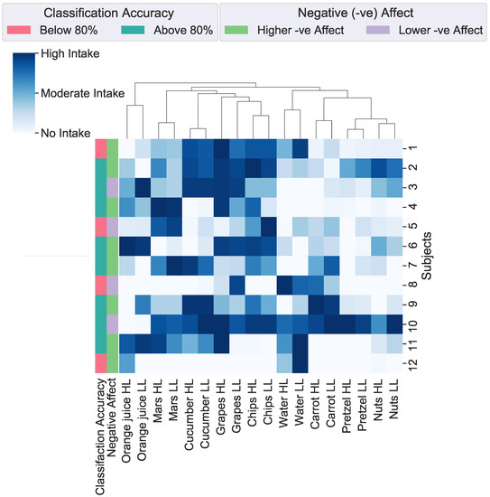 Data Aggregation: To explore the impact of cognitive load on food choice, we analysed the cognitive load classification results, food choices during both sessions, and the negative affect (from PANAS) experienced during the HL session as it impacted the subjects significantly. The collected data were aggregated and subjected to hierarchical clustering using agglomerative clustering techniques [57,58].
