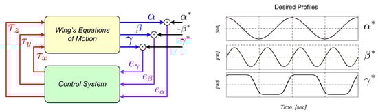 The wing motion is performed through the application of the input torques around the , , and axis, respectively. This way, the control objective is to derive convenient mathematical laws for the torque inputs in order to force the joint variables to track some desired angular profiles represented here by . The control system general overview is shown in Figure 2, in which the output error variables are highlighted together with an illustrative image of the desired angular profiles. Related to the control problem addressed here, the next section presents and discusses the Computed Torque method, which is a traditional control strategy [,,,].