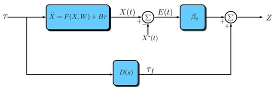From Equation (2) to Equation (3), the description of the dynamics has been conveniently rearranged to represent the set of original equations in an equivalent (still vector) set. This equivalent one now consists of a linear double integrator plant subjected to the vector input terms and , as depicted in Figure 3. In the ideal case, considering that all model parameters and variables are known and available, a control law for the torque vector could be chosen as follows.
