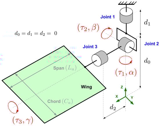 in which is the joint vector, is the torque (input) vector, is the vector of aerodynamical forces that act in the wing, is the symmetric positive definite inertia matrix, is the Coriolis matrix, and is the vector of gravity force terms and other generalized forces that act in the wing joints. All these dynamical parameters are detailed in Appendix A. Since is nonsingular due to its well-known structural property [], then Equation (1) can be rewritten as