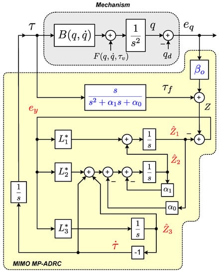 Note that ESO’s implementation of Equation (34) does not require the value of the input gain matrix B of the plant, which contrasts with other ADRC methodologies in the literature. This is due to the fact that now B is inserted within the disturbance Ω, as described by Equation (33). In this approach, B will be estimated together with Ω. This is the main feature that gives the MP-ADRC method a higher level of robustness to uncertainties in B.