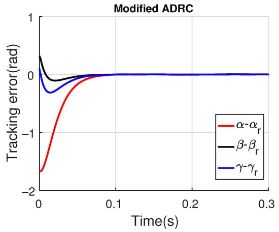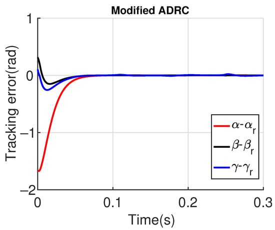 Therefore, the simulation results show that the modified ADRC presented a similar tracking error performance as the augmented PD with , but the augmented PD control signal has minor robustness to measurement noise, presenting a significantly noisier control signal. By using , the augmented PD control signal noise is reduced, although it was also higher than that of the modified ADRC. However, the tracking error performance becomes more significant in terms of small amplitude.