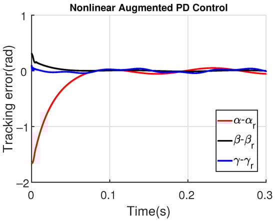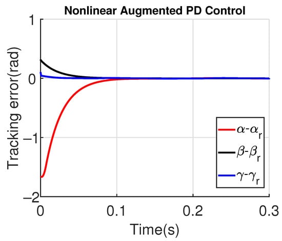 Let us define the reference trajectory vector as and the tracking error as . Then, from Equation (12), the tracking error dynamics can be described by