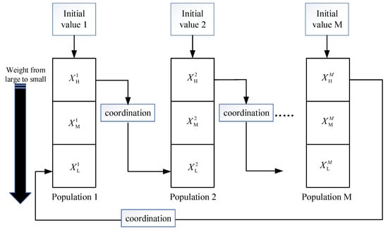 In order to solve the problem of low estimation accuracy due to the lack of particle diversity in the CRPF when the initial value is not accurate, an intelligent cooperative resampling mechanism based on ring structure is proposed in this paper. The structure of the intelligent cooperative resampling mechanism is shown in Figure 2. The particles are extracted from the importance distribution of M different initial values, and the extracted particles form a population with N particles which are mutually independent. The particles in each population were sorted according to their weights and divided into three parts according to the golden proportion. The golden proportion is strictly proportional, artistic and harmonious, and is considered to be the most ideal proportion in architecture and art. The first 0.382 N particle set is with a larger weight, the 0.382 N particle set is with the smallest weight and the remaining particle set is with a middle weight, where . The high weight particle set and medium weight particle set with a larger weight in each population are directly retained. However, since the particles in have little influence on the estimated results, all the particles in it are resampled using the cooperative strategy. In order to ensure the particle resampling order and particle diversity, the cooperation strategy between various swarms is completed based on the ring structure. When the low-weight particles of the s-th population are resampled, the high-weight particles of the s−1 population are selected for cooperation. When s = 1, then the particles are drawn from the set of high-weight particles of the M-th population for cooperation, and the details of the cooperation strategy will be described in Section 3.2. After resampling all the particles with low weights in M populations, the weights of the particles are recalculated. The weighted sum of all particles in each population is used to obtain the state estimate value, and then the final state estimate value of the whole particle set is obtained.