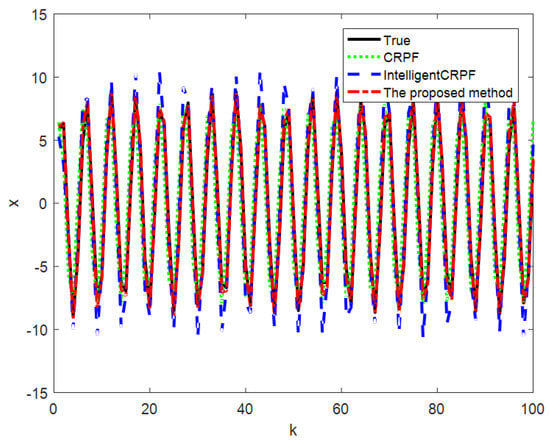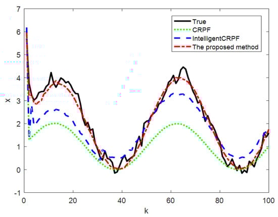 In this simulation, , is the random number subject to uniform distribution , and the initial value of , is the random number subject to uniform distribution . Each independent repeated experiment is randomly generated. The population number of this method is M = 3, and the particle number of each population is N = 80. The initial state values of the three populations are , and , respectively, and the variation rate of Gaussian mutation is 2. The particle numbers of the standard CRPF and MH-CRPF are both 240, and the initial particle values are random numbers that follow uniform distribution .