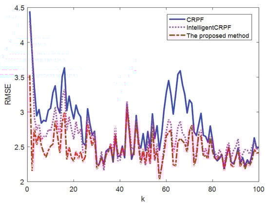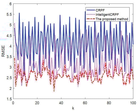 Figure 5 shows the comparison of the average values of the 100-time state estimation results of the one-dimensional nonlinear univariate time series model by the three methods. Figure 6 shows the RMSE comparison of the 100-time state estimation results of the three methods. It can be seen from Figure 5 and Figure 6 that the proposed method can track the real state well, but MH–CRPF (Intelligent CRPF) has a certain error in the estimation process, while the CRPF has a large error. Table 2 shows the RMSE and MAE of 100 independent repeated experiments estimated by the three methods for the one-dimensional nonlinear univariate time series model. As can be seen from Table 2, the RMSE and MAE of the proposed method are always the smallest, followed by MH-CRPF (Intelligent CRPF) and the largest CRPF. Therefore, when the initial state value is unknown, the state estimation accuracy of the proposed method for the one-dimensional nonlinear univariate time series model is higher than that of the other two methods, due to the multi-population intelligent cooperative resampling mechanism.