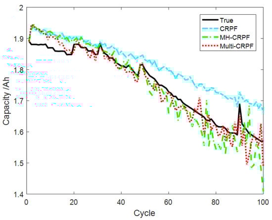 This simulation selects the data of the B0007 lithium–ion battery, which is widely used in the verification experiment of lithium battery remaining life prediction []. These data from NASA laboratories are common to international simulation experiments. In this simulation, the population number and particle number are the same as in Section 4.1, the rate of Gaussian mutation is , the particle number of the other two methods is 240 and the process variances are all random numbers.
