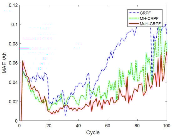 Figure 7 shows the comparison curve of prediction results of 100 independent repeated experiments on the remaining life of the B0007 lithium battery by the three methods. It can be seen from Figure 7 that the three methods can track the actual curve well. However, with the increase in the service cycles, the CRPF and MH-CRPF gradually deviate from the actual curve. The proposed method in this paper can always track the actual curve well. Figure 8 shows the comparison of the MAE of the remaining life prediction results of the B0007 lithium battery by the three methods. As can be seen from Figure 8, the deviation between the CRPF and MH-CRPF keeps increasing with the increase in time. The deviation of the proposed method (Multi-CRPF) is smaller than that of the other two methods. The proposed method shows better prediction accuracy. Table 3 shows the RMSE and MAE of 100 independent repeated experiments predicted by the three methods for the remaining life of the B0007 lithium battery. As can be seen from Table 3, the RMSE and MAE of the predicted results of the proposed method are both smaller than those of the other two methods. It can be concluded that, compared with the standard CRPF and MH-CRPF, the proposed method has better performance in predicting the remaining useful life of lithium batteries, especially when the initial value of the system state is unknown.