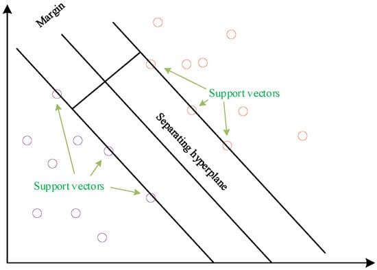 Support vector machine (SVM) is a powerful and widely used machine learning algorithm for classification and regression problems. It offers numerous advantages, including the use of a small number of training samples, a short training time, and a simple structure []. The fundamental idea behind SVM is to find an optimal hyperplane that separates samples from different classes. In binary classification problems, the hyperplane can be viewed as an (n-1)-dimensional decision boundary, where n represents the number of features. The goal of the algorithm is to identify a hyperplane with the largest possible margin, thereby maximizing the separation between samples from different classes. The samples that are closest to the hyperplane are referred to as support vectors, as depicted in Figure 2.