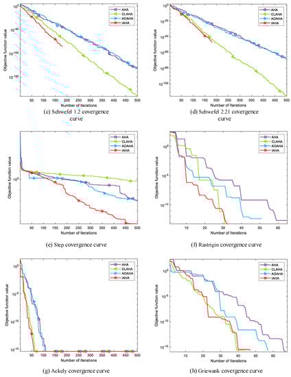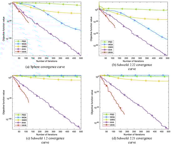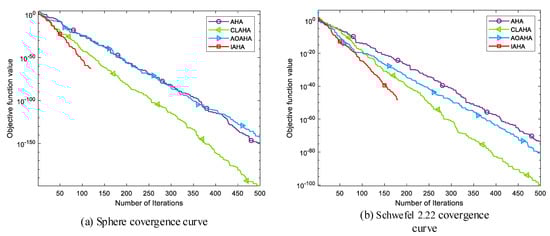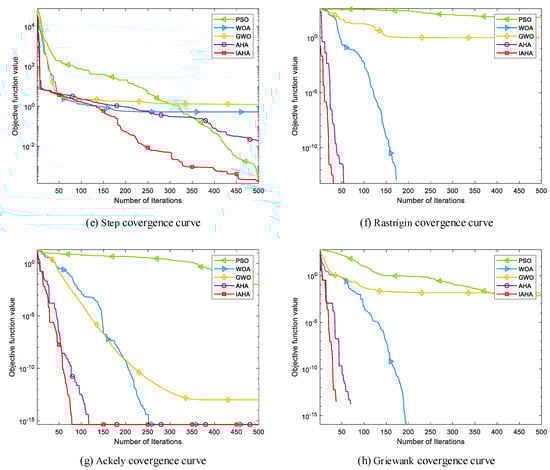 Based on the analysis presented Table 2, it can be observed that in unimodal functions , the IAHA algorithm achieves the theoretical optimum with a mean value, and the standard deviation is 0. In unimodal function , the IAHA algorithm’s mean value is closer to the theoretical optimum, and the standard deviation is minimized. From this, it can be inferred that the IAHA algorithm exhibits a stronger exploration capability and stability during the optimization process.