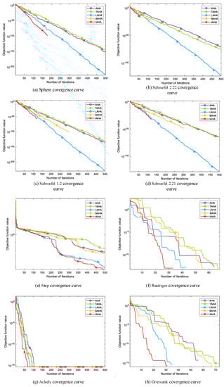 From the analysis in Table 3, it can be observed that in unimodal functions , TAHA does not show a significant improvement in optimization accuracy compared to standard AHA. However, it consistently exhibits a smaller standard deviation, ensuring the stability of the algorithm. Therefore, by combining Tent chaotic mapping and the reverse learning strategy for population initialization, the algorithm can achieve a more stable optimization performance. In comparison to standard AHA, LAHA shows a significant improvement in optimization accuracy. This is due to the introduction of the Levy flight strategy in the algorithm, which enhances both local search accuracy and the ability to quickly escape local optima. While DAHA can find the theoretical optimum in the test functions, its optimization accuracy is not as good as that of other improvement strategies in the function. On the other hand, IAHA not only achieves the theoretical optimum in the functions but also maintains high optimization accuracy in the function. In multimodal functions , all the improvement strategies yield the same optimization values. Additionally, in the and functions, all algorithms are able to find the theoretical optimum.