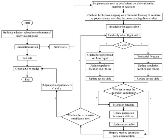 Step 2: The SVM penalty-term coefficients (C); kernel function parameters (g); and IAHA-related parameters, including population size, maximum number of iterations, etc., are initialized; Step 3: The food source locations are initialized using a fused Tent chaos mapping and direction-learning strategy, and the training-set samples are classified, with the SVM coal mine environmental safety classification accuracy as the individual fitness value; Step 4: Flight skills are randomly selected; Step 5: The phase of guided foraging or area foraging based on the Levy flight strategy begins, with a 50% probability of each of the two foraging behaviors. The visit table is updated after the foraging behavior; Step 6: When migratory foraging conditions are met, hummingbirds perform migratory foraging, randomly replacing the worst food source location. The access table is updated after the foraging behavior; Step 7: The location of poor food sources is optimized using the simplex method; Step 8: The algorithm is terminated if the IAHA algorithm termination condition is met and the optimal C and g parameter values are output; otherwise, return to step 4; Step 9: The IAHA-SVM coal mine environmental safety warning model is established. |
