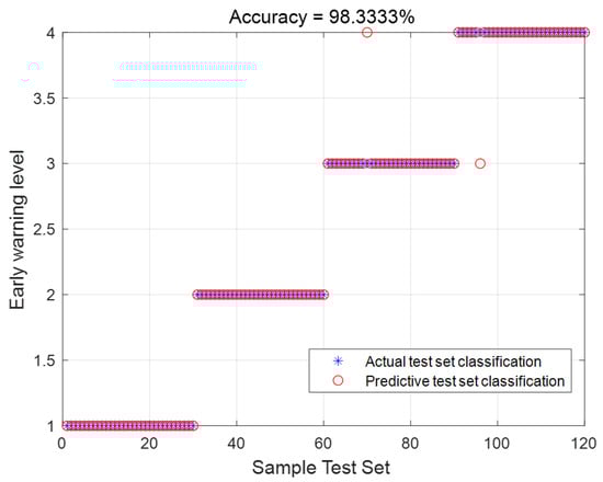 In this section, a total of 4120 data samples are selected for the simulation experiment. Among them, 4000 samples are used for training, with 1000 samples for each warning level. The remaining 120 samples are used for testing, with 30 samples for each warning level. The purpose of the experiment is to find the optimal penalty factor (C) and kernel function parameter (g) to achieve the best classification performance based on the accuracy of the training data levels. The parameter range is set from 0 to 1000. The experimental results are shown in Figure 8. From the figure, it can be observed that out of the 120 test data samples, only 2 data samples were misclassified, resulting in a classification accuracy of 98.3333%.