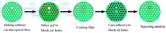 The liquid analyte can be filled into the elliptical air hole by capillary phenomenon. First, pores that do not need to be filled should be blocked with curing adhesive, then, the filling of the analyte is realized by capillary absorption. Direct injection method can also be used to fill the liquid analyte into the elliptical air hole. For viscous liquid, in order to avoid the capillary effect and the influence of viscosity on liquid filling, a syringe can be used to pump the liquid into the air hole of the optical fiber through pressure. In order to avoid contaminating the analyte, the sensor should be repeatedly cleaned with alcohol before and after each test to ensure the cleanness of the sensing area. The whole preparation process of optical fiber is shown in Figure 2.