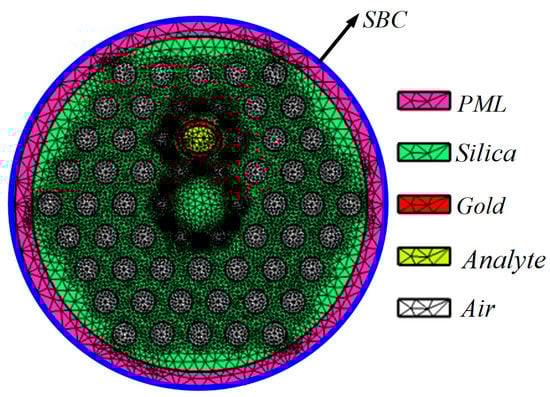 In the simulation, we use the FEM to study the mode characteristics and the dispersion curves of the fundamental mode and the surface plasmon polaritons (SPP) mode. A perfectly matched layer (PML) is added to the periphery of the cladding to absorb reflection. The boundary condition of the periphery is the scattering boundary condition (SBC). Its physical meaning is that it is completely transparent to some specific known wave vectors. In this paper, the free triangle mesh is used to discretize the whole solution domain. The maximum cell size is 2140 nm, and the minimum cell size is 42.8 nm. The whole calculation region contains 19,326 solution elements, with a total degree of freedom of 135,387. The meshing results are shown in Figure 3.