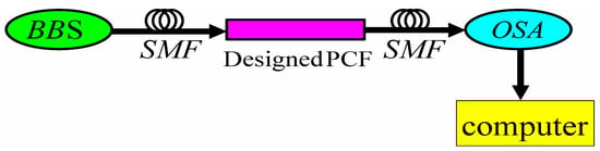 The PCF-SPR RI sensor designed in this paper can adopt the system structure as shown in Figure 4, including broadband light source (BBS), single-mode fiber (SMF), PCF-SPR RI sensor, optical spectrum analyzer (OSA) and computer. The experimental process can be carried out in the following steps. First, the liquid analyte is sucked into the elliptical channel by means of “siphon”, and then the BBS is used to generate broadband continuous beam. The incident light is transmitted to the PCF-SPR through SMF. The loss information is transmitted to the OSA through an SMF. Finally, the results are calculated and analyzed by computer.