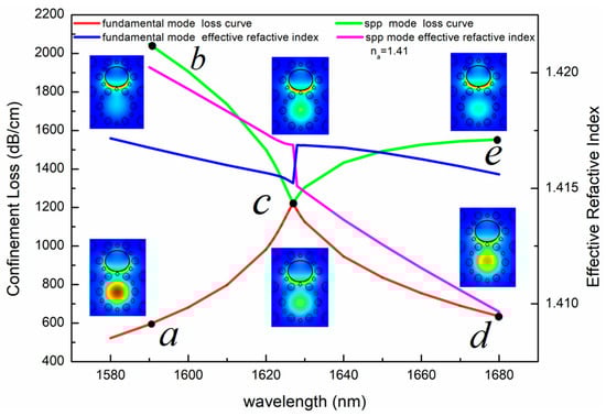 Calculated loss spectrum and dispersion relations of the fundamental mode and the SPP mode at na = 1.41. Insets are electric field distributions of various wavelength. At points a and b, the corresponding wavelength is 1590 nm, at point c, the corresponding wavelength is 1627 nm, and at points e and d, the corresponding wavelength is 1680 nm.