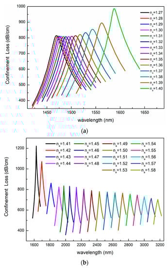 Firstly, we studied the optical fiber sensing characteristics under the different Ris of liquid analytes. In the simulation, we varied the RI of the liquid analyte and the structural parameters (Ʌ = 2170 nm, d1 = 400 nm, d2 = 800 nm, d3 = 1200 nm, a = 1500 nm, b = 1300 nm, t = 40 nm) remained unchanged. Figure 6 depicts the relationship between the confinement loss and wavelength as the RI changes. It can be seen intuitively that the resonance wavelength is red shifted with the increasing RI of the liquid analyte. This is because the RI of the SPP mode increases as the RI of the liquid analyte increases, while that of the fundamental mode changes little, which causes the resonance point to shift toward longer wavelengths. At the same time, the numerical value of the confinement loss decreases as the RI of the analyte increases.