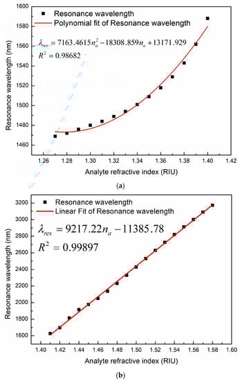 where represents the resonant wavelength, and is the RI of the analyte. According to the fitting results, when the RI of the analyte changes from 1.27 to 1.40, the relationship between the resonant wavelength and the RI meets the quadratic curve as shown in Figure 7a. When the RI changes from 1.41 to 1.58, the resonant wavelength and RI satisfy the linear relationship as shown in Figure 7b.