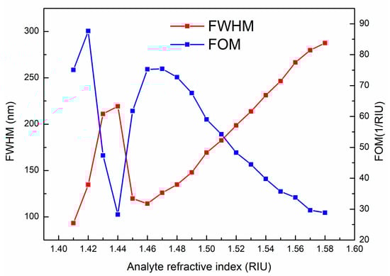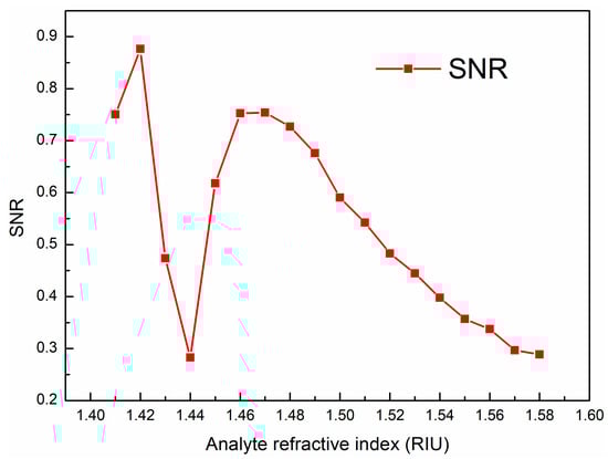 where represents the difference between two adjacent resonant wavelengths. Figure 8 describes the relationship between the FOM, FWHM and analyte RI. The FOM reaches the maximum value of 87.648 RIU−1 when the RI of the analyte is 1.42, and then decreases. Next, the FOM reaches its second largest peak value when the RI of the analyte is 1.47, and then begins to slowly decrease. The change trend of the FWHM is basically opposite to that of the FOM. The sensor’s SNR is shown in Figure 9. The variation trend of the SNR with RI is basically consistent with that of the FOM. The highest SNR value is found to be 0.876 when the RI of the analyte is 1.42.