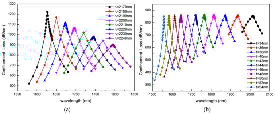In order to investigate the impact of fiber structural parameters on sensing performance, we discussed the changes in loss peaks when structural parameters change. The results are shown in Figure 10, Figure 11 and Figure 12. As shown in Figure 10a, we make the lattice constant Ʌ vary from 2170 nm to 2240 nm while keeping all other structural parameters unchanged. It can be established that the confinement loss of the fundamental mode decreases when the lattice constant Ʌ is increasing. This is because the lattice constant represents the lattice period of the photonic crystal, and with the increase in the lattice constant, the resonance intensity between the fundamental mode and the SPP mode decreases. Thus, the energy is limited to the core and the confinement loss reduces. Meanwhile, the resonance wavelength is red shifted with the increase in the lattice constant Ʌ.