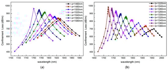 The confinement loss depending on the wavelength as (a) long half axis increases from 1460 nm to 1580 nm and (b) short half axis increases from 1220 nm to 1380 nm. The other structural parameters are na = 1.43, d1 = 400 nm, d2 = 800 nm, d3 = 1200 nm, Ʌ = 2170 nm, t = 40 nm.