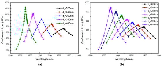 Figure 12 describes the loss curve of the sensor when the air holes around the fiber core and sensing channel changes. Figure 12a describes the confinement loss as d1 increases from 320 nm to 400 nm, and Figure 12b describes the confinement loss as d2 increases from 720 nm to 840 nm. As can be seen from Figure 12a,b, the resonance wavelength undergoes a blue shift and the resonance peak increases with the diameters of the two types of air holes increasing. This is because the increase in pore size promotes the leakage of the mode field from the core, resulting in worse constraints on the core. Thus, by changing the size of the two types of air holes, we can adjust the resonance wavelengths of the two modes.