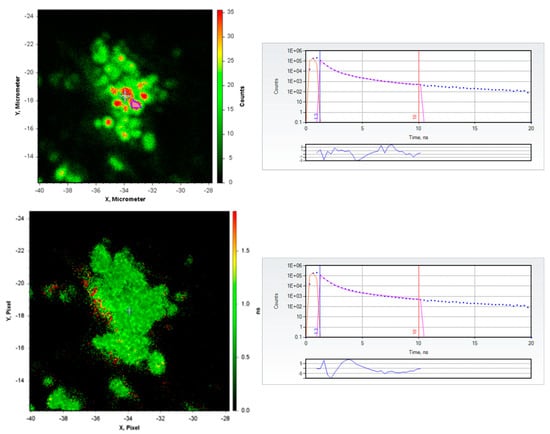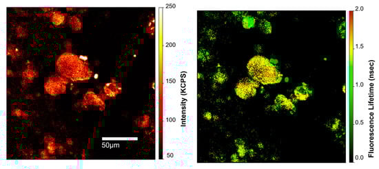 Finally, we are grateful to one of the reviewers for suggesting that some of our readers might find it useful to briefly compare the techniques and instruments of FLIM (fluorescence lifetime imaging microscopy) and FLIO (fluorescence lifetime imaging ophthalmoscopy), since the former has become widely available and the latter is just being introduced. The two techniques are fundamentally similar, in that they construct an image typically collected by scanning the target (either a microscope specimen for FLIM, or the retina in vivo for FLIO) with an exciting, short pulse laser beam and timing the arrival of emitted fluorescence photons from each pixel, where the contrast in the image arises from differences in fluorescence lifetime of the individual pixels. At first glance, the FLIM and FLIO instruments look and operate much like their familiar steady state counterparts, but the data (i.e., Figure 1(right panel) and Figure 3(lower left panel)) provide fundamentally different information than the intensity and color seen in typical fluorescence images. Optically, FLIM and FLIO instruments are not too different from typical scanning epifluorescence microscopes (such as confocal or multiphoton microscopes) or scanning laser ophthalmoscopes, respectively. Of course, they differ in that the microscope is used on small, isolated, sometimes nonliving specimens such as cells or tissues (as in our study), whereas the FLIO is designed for imaging the retina through the intact lens, cornea, and the rest of the eye’s optical path in a living subject. Obviously, this confers additional requirements on the FLIO’s peak excitation intensity, wavelength, and other features for the safety and comfort of the human subject. The characteristics of several examples of FLIO lifetime retinal images (and how they differ from other retinal imaging methods such as OCT, FAF, fluorescence angiography) can be seen in Reference [16].
