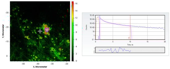 Fluorescence intensity micrograph (left panel) of doxycycline-stained drusen in the retina of a 79-year-old white male donor (cause of death: chronic myelocytic anemia); the intensities are false colored according to the scale (arbitrary units) on the right of the image. The (right panel) shows the time-resolved fluorescence decay of the aggregated pixels in the indicated region of interest (pink); The purple dots indicate the individual time-resolved fluorescence intensity data points, the red line through the dots indicates the best fit to the data, the orange curve before two nanoseconds indicates the instrument response function, and the vertical lines at 1.3 and 10 nanoseconds indicate the beginning and end, respectively, of the data included in the fit. The solid purple line in the lower part of the right panel depicts the “residuals”: the differences between the actual measured data points and the values calculated for that time point by the best fit parameters.
