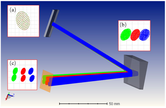 Cross-dispersion refers to the two-dimensional spectral dispersion achieved by passing light through two dispersion directions perpendicular to each other. Figure 2 illustrates the principle of cross-dispersion using the "grating + prism" configuration for six wavelengths. The point column diagrams of the grating, prism, and detector surfaces are shown in Figure 2a, b and c, respectively. After passing through the grating, the polychromatic light achieved good dispersion in a single order but with severe overlap between orders. However, after cross-dispersion using a prism, the spacing between orders significantly increased, improving the resolving power of the instrument. Cross-dispersion elements also called “auxiliary dispersion elements” are commonly used with planar gratings or prisms. The best cross-dispersion effect was achieved by matching different types of gratings and prisms. In addition, some researchers have used a dual-pass system to improve the resolution and throughput further [22]. However, cross-dispersion also has limitations, one of which is its sensitivity to placement errors, causing significant performance degradation. Automatic collimators and other alignment techniques are required to overcome these limitations.